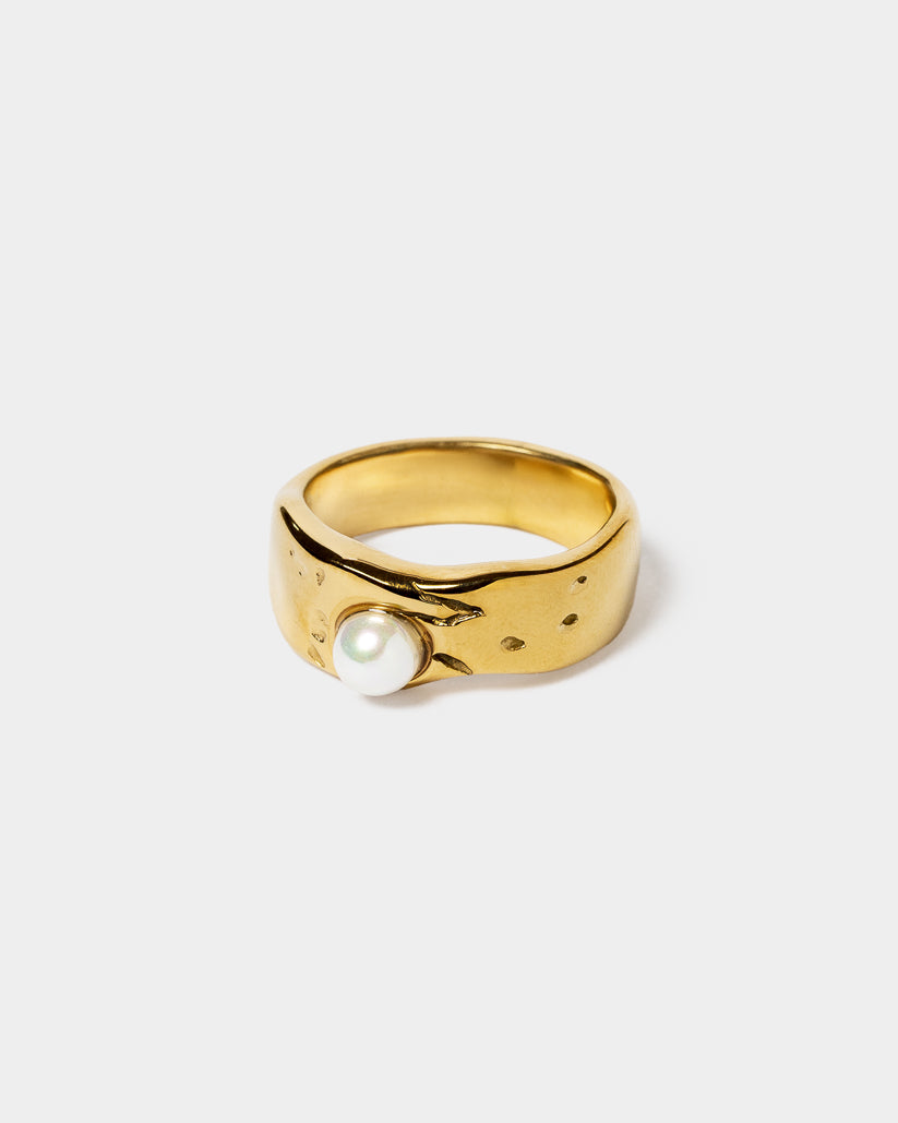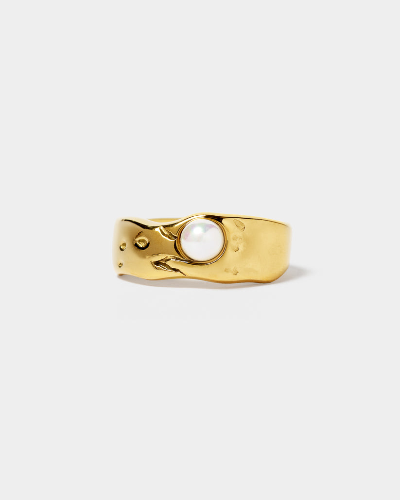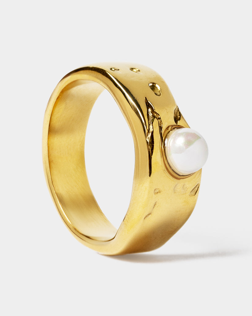 El anillo AURENYS destaca por su diseño ancho y orgánico con una perla central que aporta elegancia y un toque único para cualquier look.