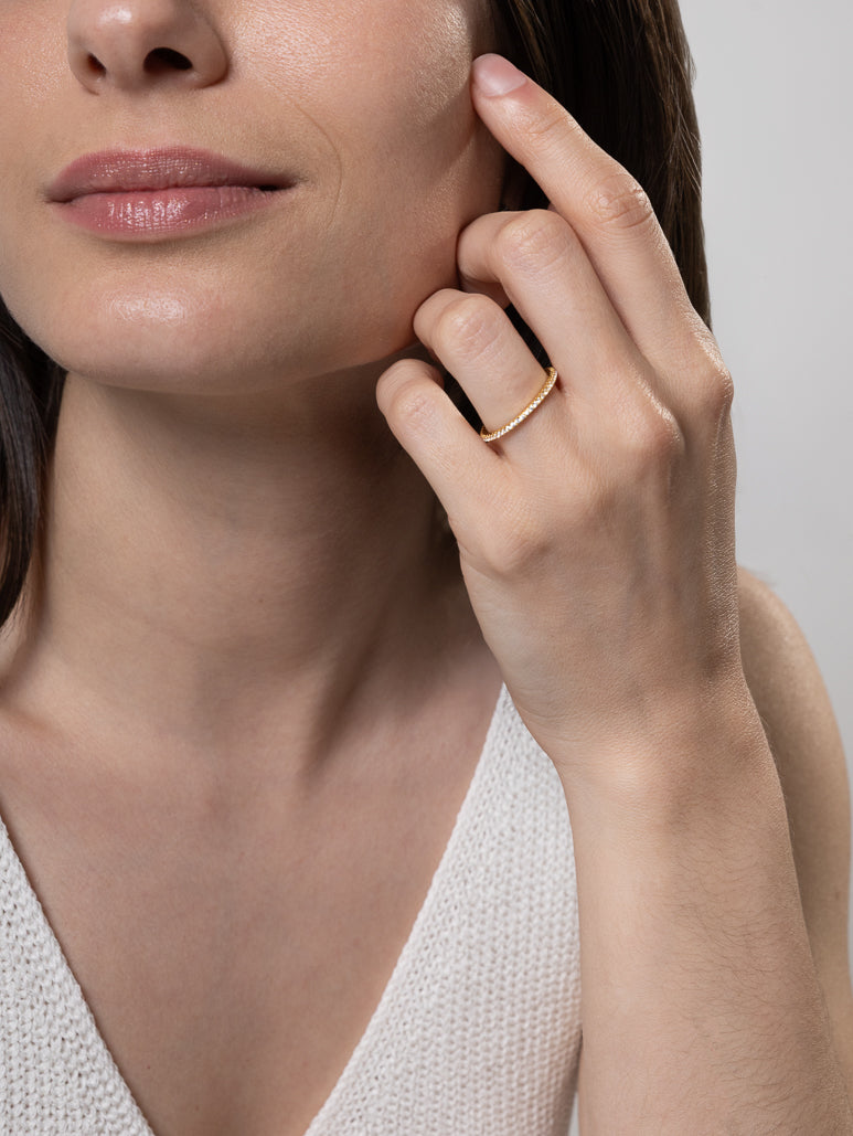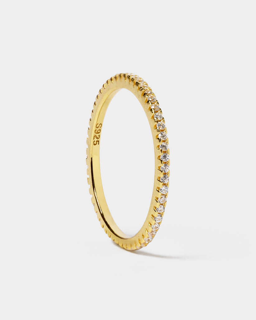 El anillo LYSARA es un delicado básico imprescindible, rodeado de circonitas que aportan un brillo refinado, realzando su elegancia y sofisticación en cualquier ocasión.