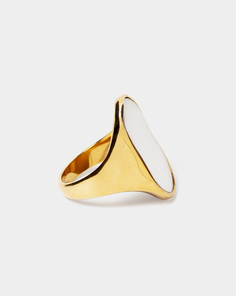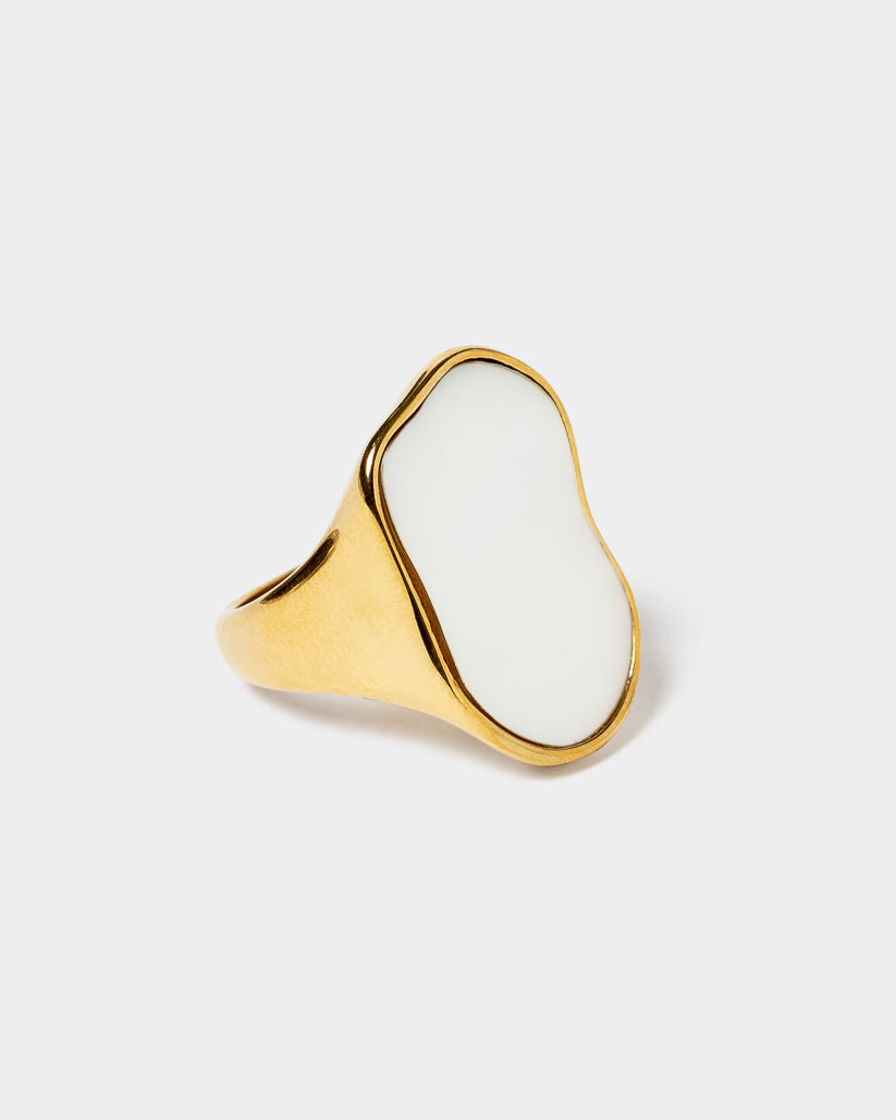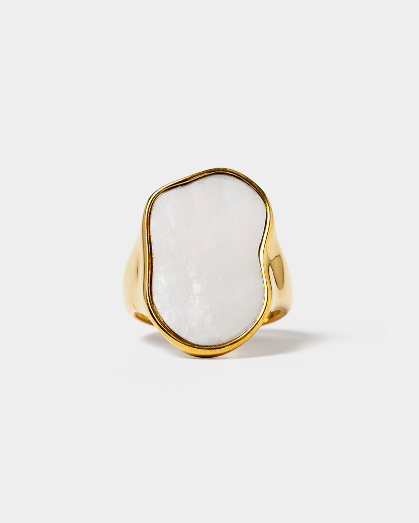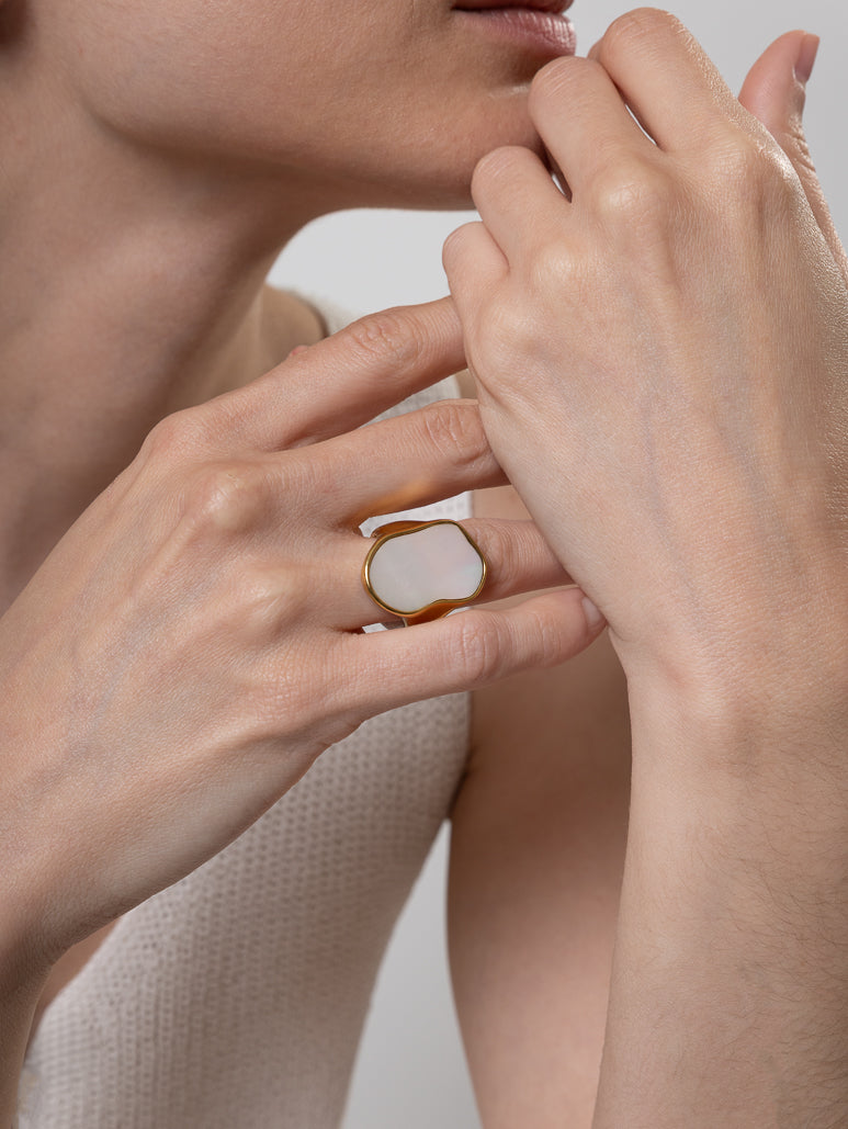 El anillo MYRISSÉ es una pieza tipo stamp con superficie ancha e irregular que refleja un brillo iridiscente, aportando un toque sofisticado y distintivo a tu look.