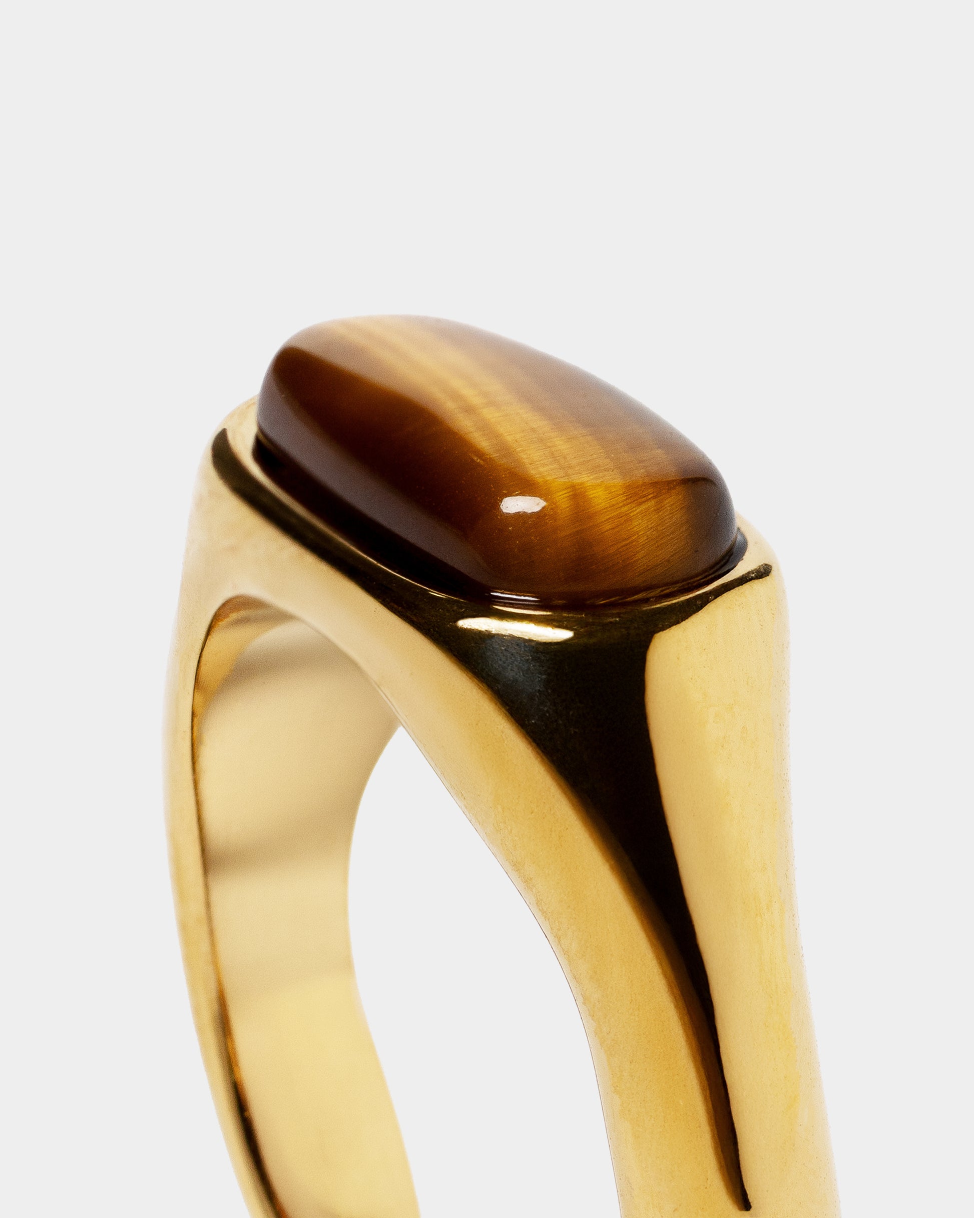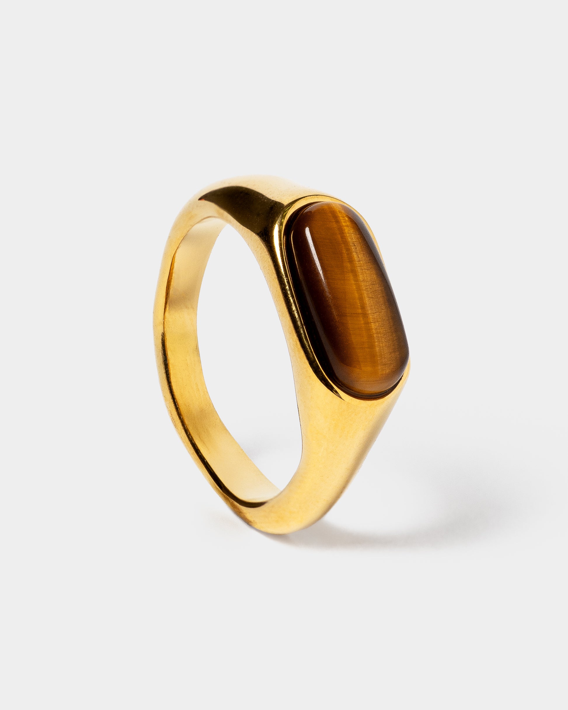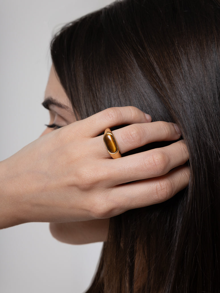 El anillo SOLENNEA, con gema tiger eye, aporta un toque exclusivo y sofisticado, siendo el complemento ideal para cualquier look elegante y refinado.