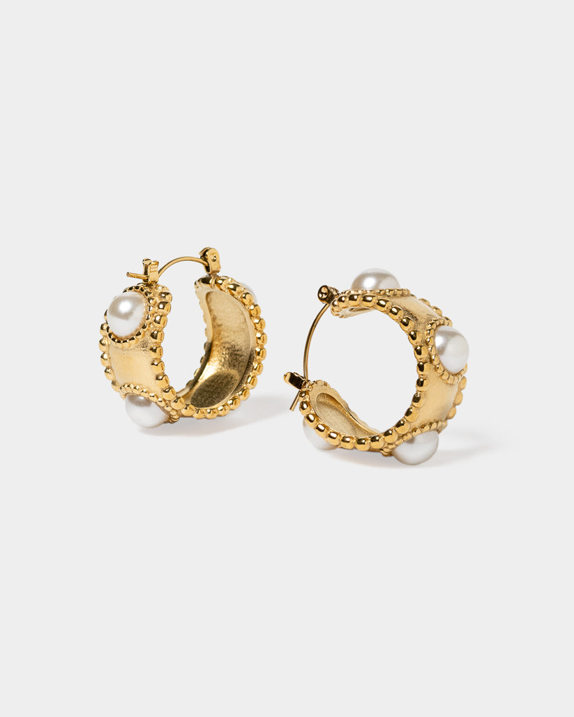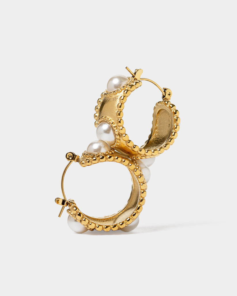 Los aros AZALEI, con volumen y detalles en bordes, llevan una delicada fila de perlas que aporta elegancia y un estilo sofisticado y atemporal.