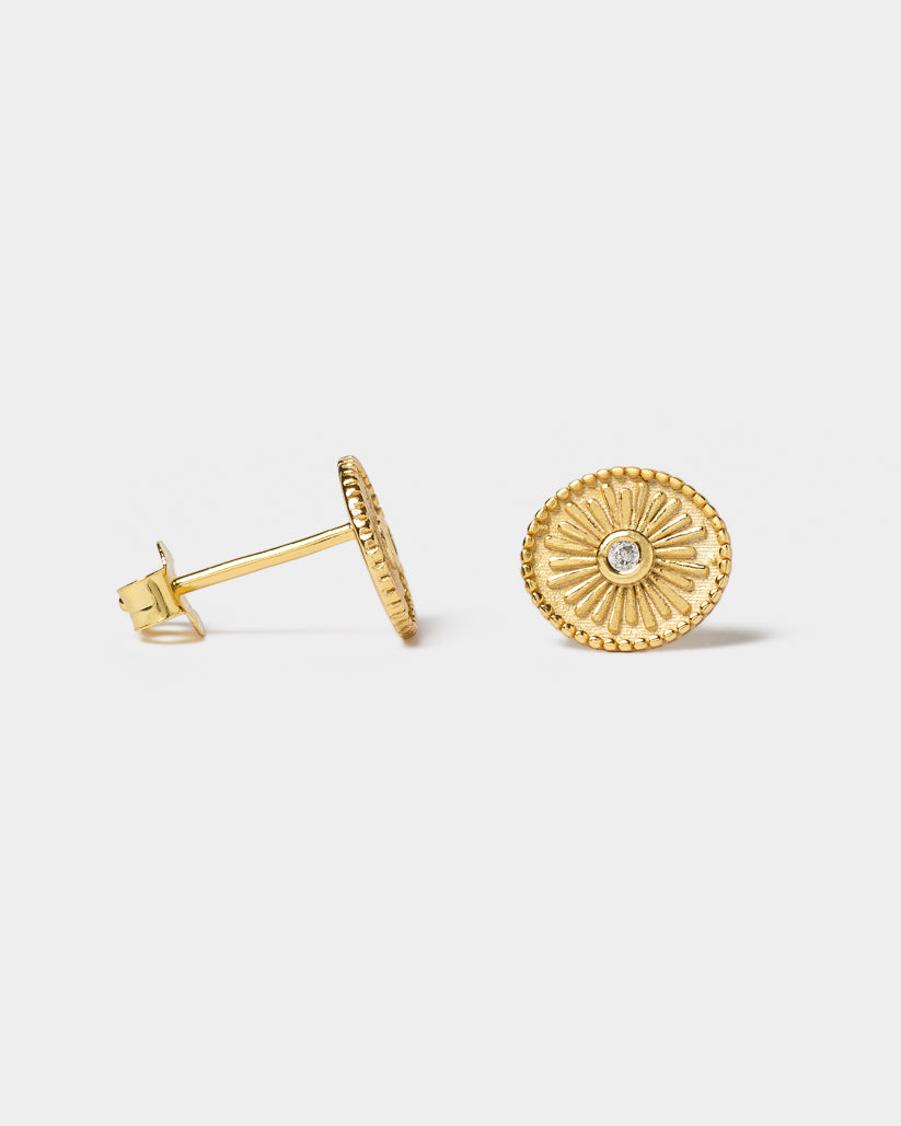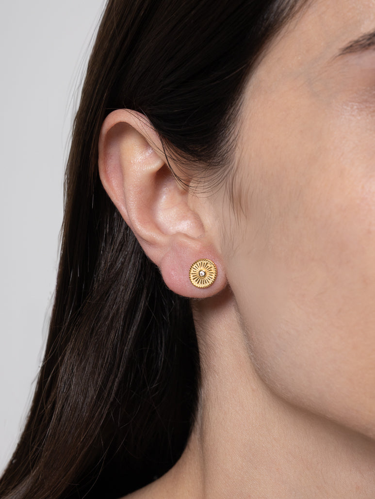 Los pendientes FLÉORA son botones con grabado simétrico y circonita central, que combinan tradición y sofisticación para un estilo elegante y atemporal.